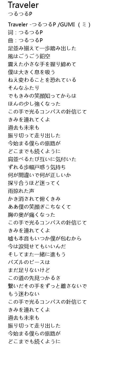 | [00:00.00] | Traveler -つるつるP /GUMI (ミ) |