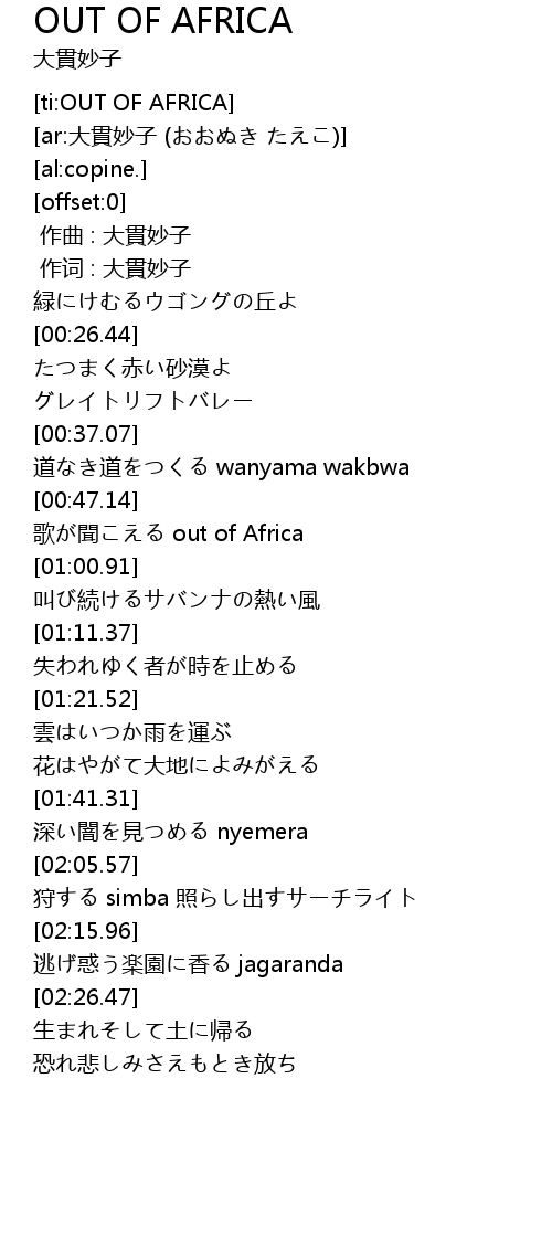 | [00:55.82] | 歌が聞こえる out of Africa |