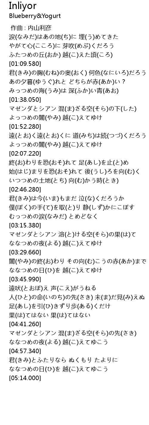 | [03:37.500] | ななつめの日(ひ)を 越(こ)えてゆけ |