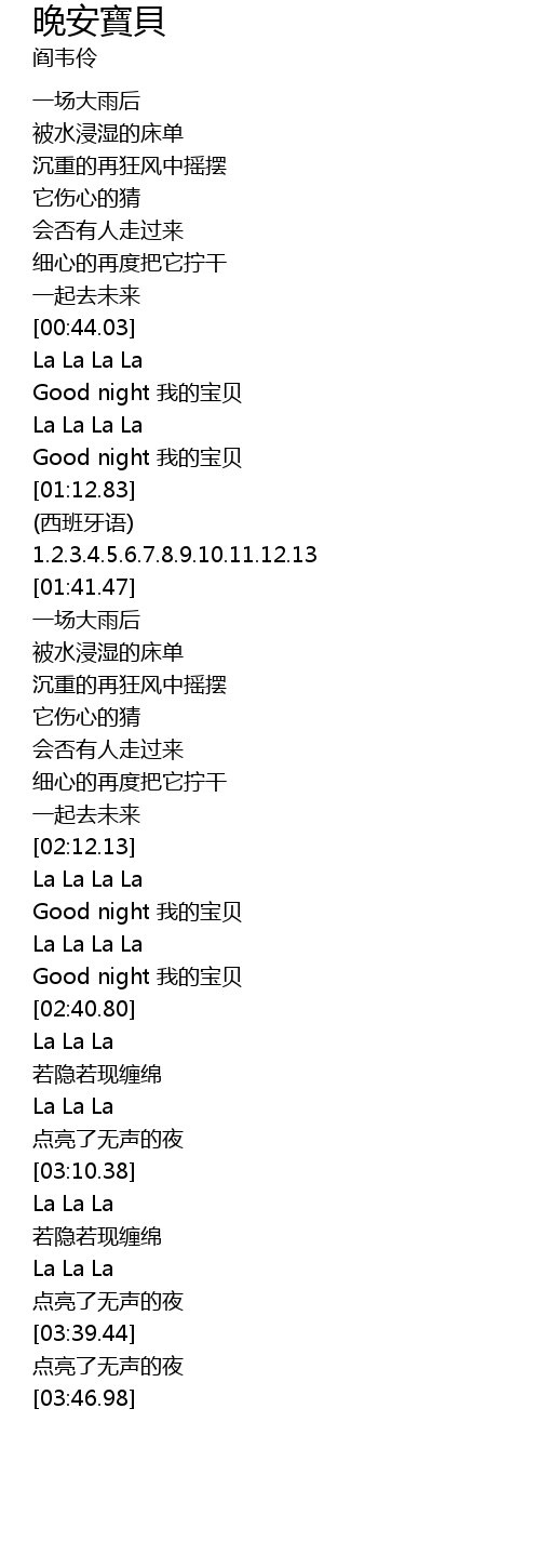 | [01:03.92] | Good night wǒ de bǎo bèi |