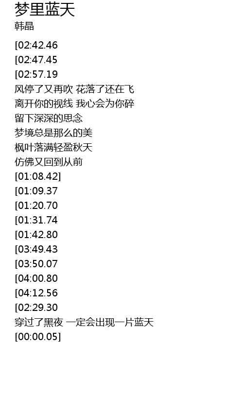 | [05:21.61][02:42.46][00:00.29] | han jing meng li lan tian |
