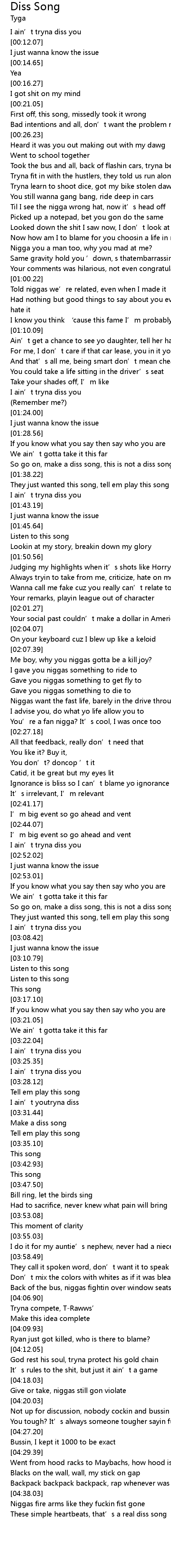 | [03:23.42] | I ain' t tryna diss you |