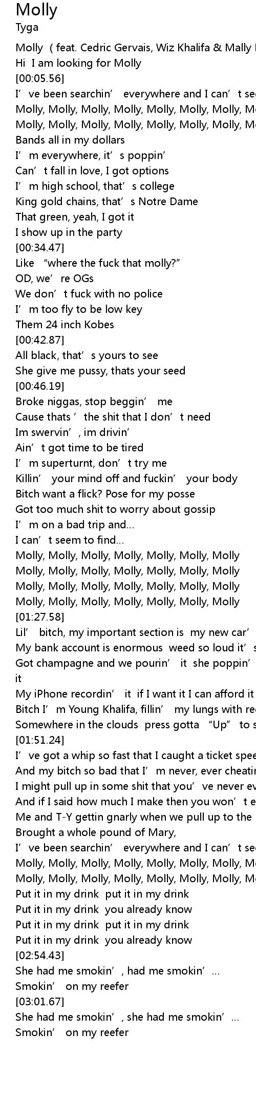 | [00:35.47] | Like " where the fuck that molly?" |