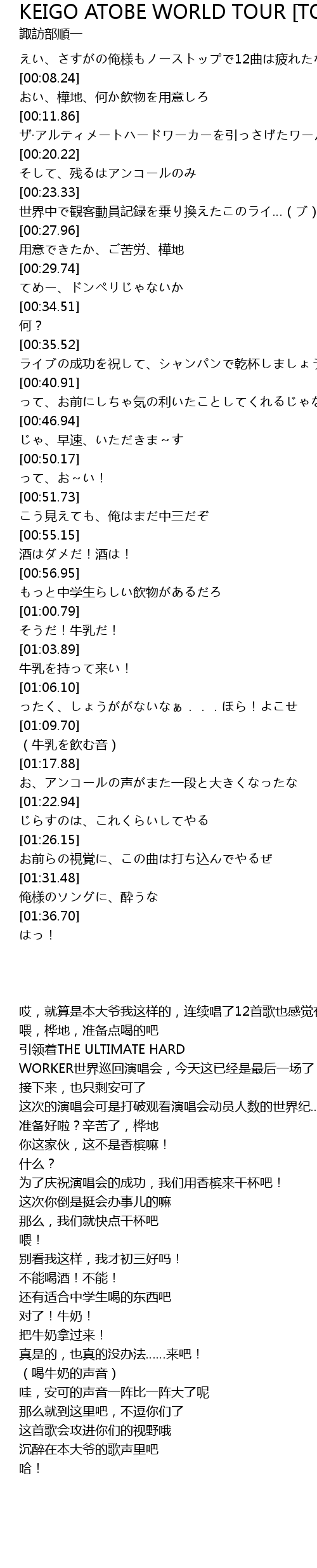 | [00:14.51] | ザ·アルティメートハードワーカーを引っさげたワールトツアーも、このステージがファイナル |