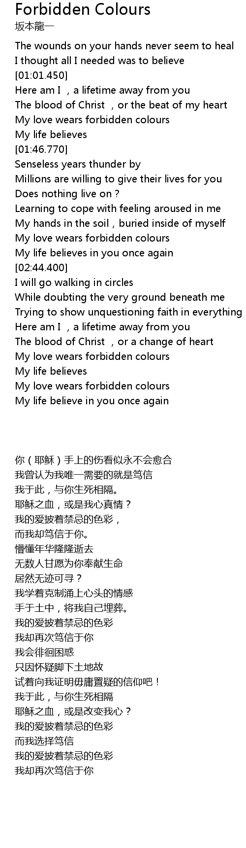 | [02:22.300] | My love wears forbidden colours |