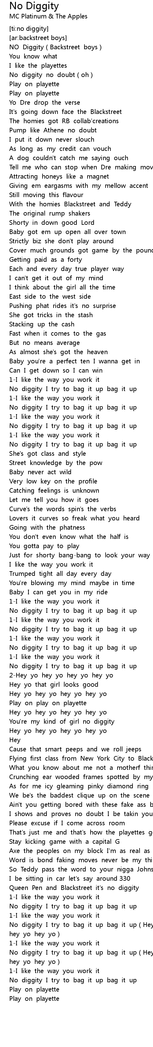 | [04:14.730] | No diggity I try to bag it up bag it up Hey yo hey yo hey yo hey yo |