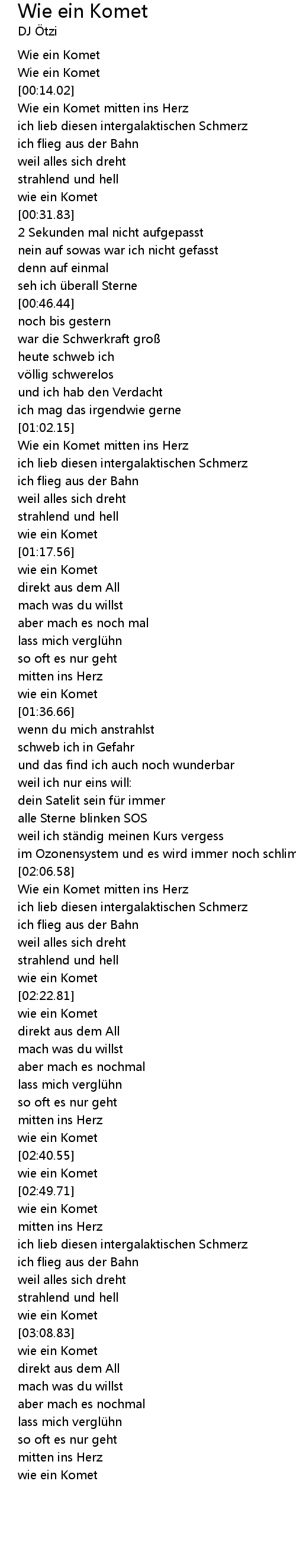 | [02:07.96] | Wie ein Komet mitten ins Herz |