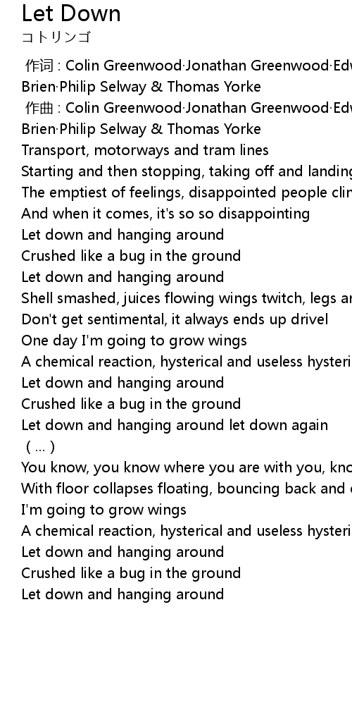 | [00:00.000] | 作词 : Colin Greenwood·Jonathan Greenwood·Edward O' Brien·Philip Selway & Thomas Yorke |