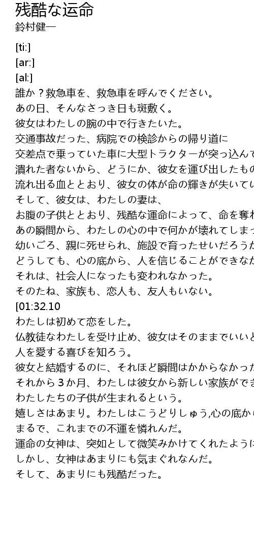 | [00:49.77] | お腹の子供ととおり、残酷な運命によって、命を奪われたっだ。 |