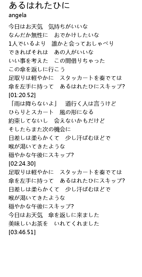 | [01:13.20] | 傘を左手に持って あるはれたひにスキップ? |