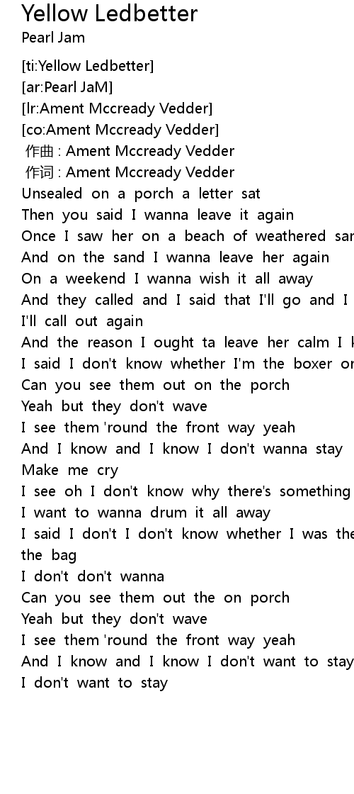 | [00:01.00] | 作词 : Ament Mccready Vedder |