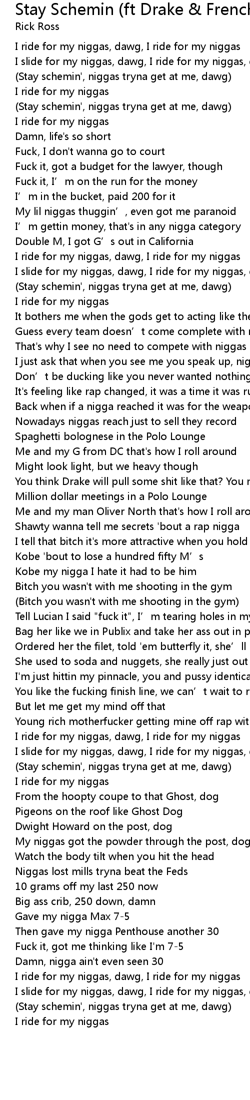 | [02:52.89] | Young rich motherfucker getting mine off rap with my niggas |