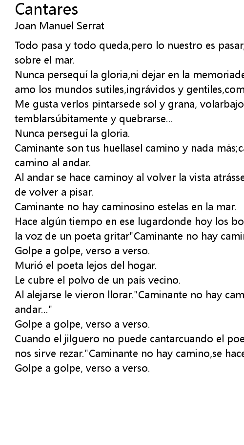 | Hace algún tiempo en ese lugardonde hoy los bosques se visten de espinosse oyó la voz de un poeta gritar"Caminante no hay camino,se hace camino al andar..." | |