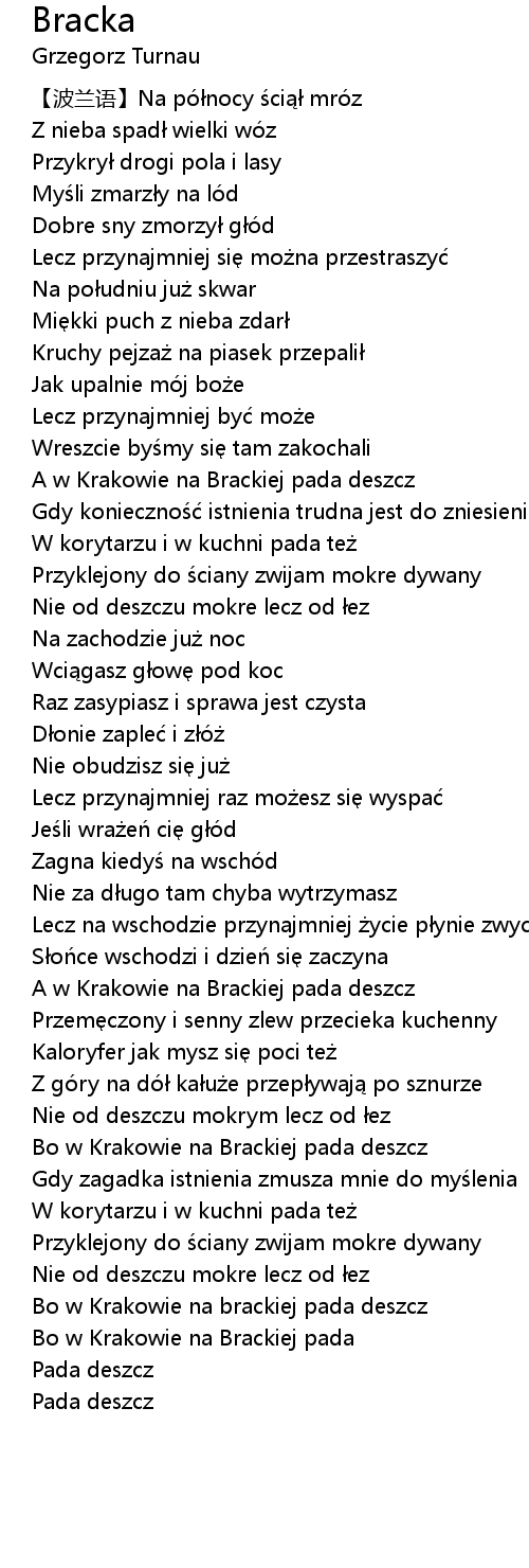 | [03:26.13] | Bo w Krakowie na Brackiej pada deszcz |