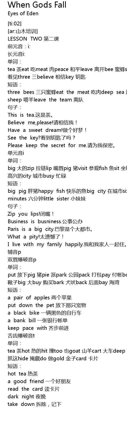 | [02:45.454] | tea 茶hot 热的hit 撞too 也goat 山羊cart 大车deep 深hold 抓这hide 掩藏do 做gold 金子card 卡片 |
