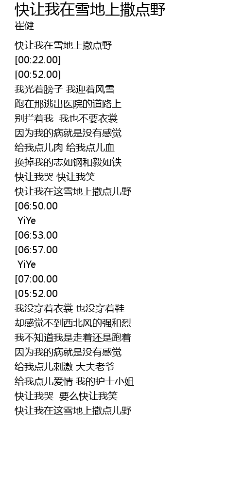 | [07:14.00][07:00.00][06:46.00][05:48.00][05:34.00][03:52.00][03:38.00][02:41.00][02:26.00] | 快让我在这雪地上撒点儿野 |
