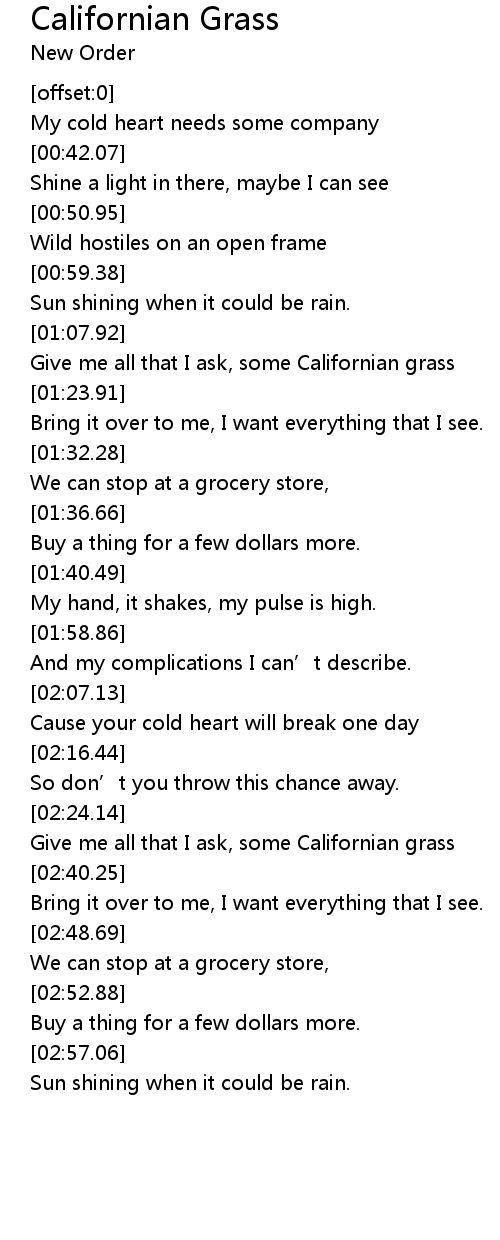 | [01:17.58] | Give me all that I ask, some Californian grass |