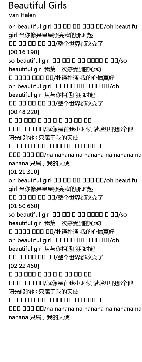 | [00:01.150] | oh beautiful girl oh beautiful girl dāng nǐ xiàng shì xīng xīng zhào liàng wǒ de nà shí qǐ |