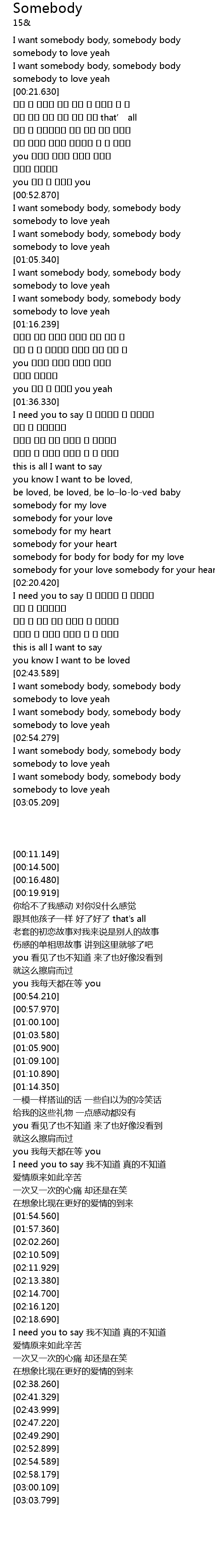 | [00:11.149] | I want somebody body, somebody body |