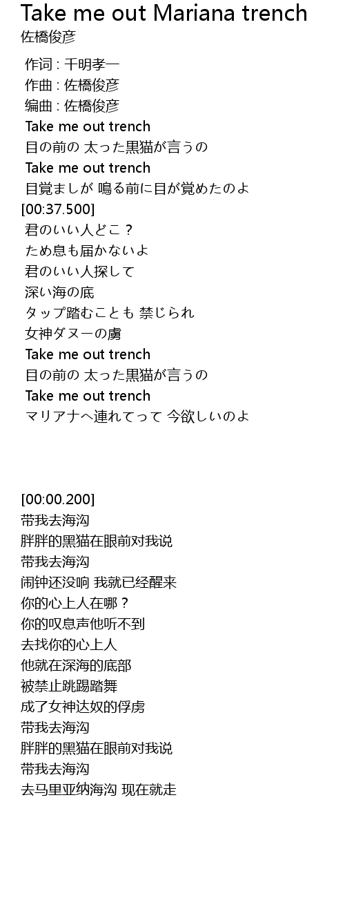 | [01:32.820] | マリアナへ連れてって 今欲しいのよ |