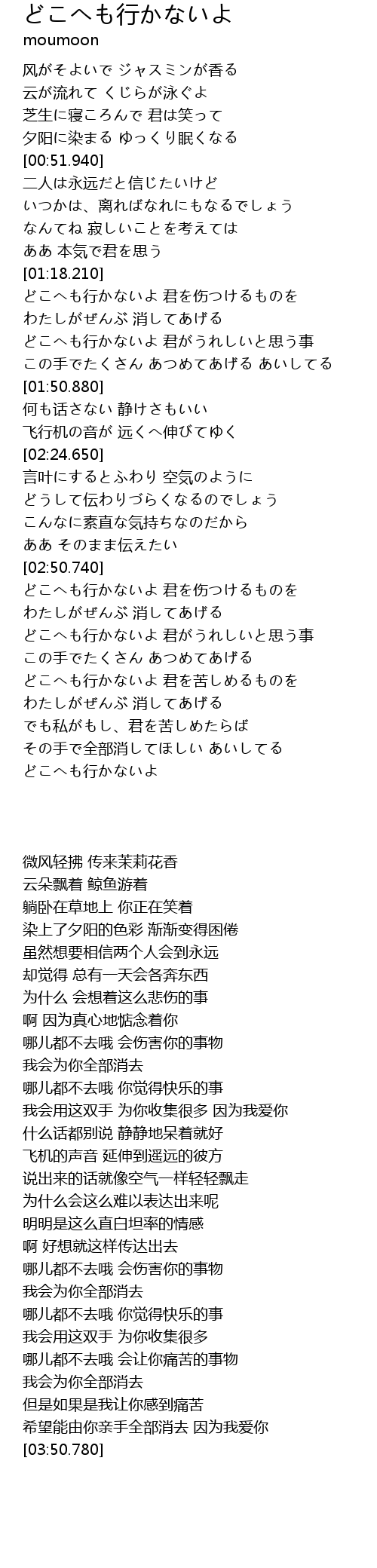 | [03:06.390] | どこへも行かないよ 君がうれしいと思う事 |