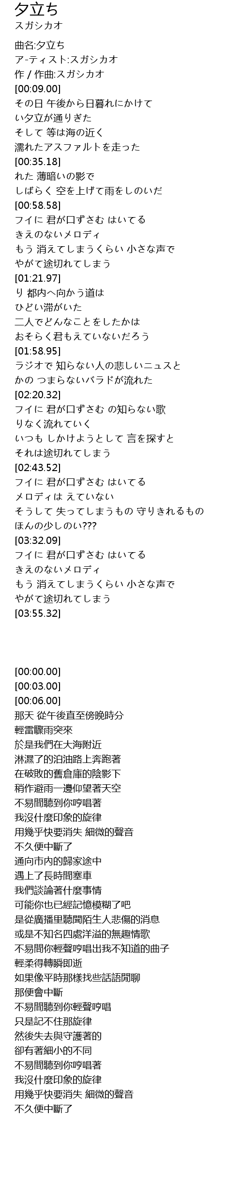 | [03:33.36] | フイに 君が口ずさむ はいてる |