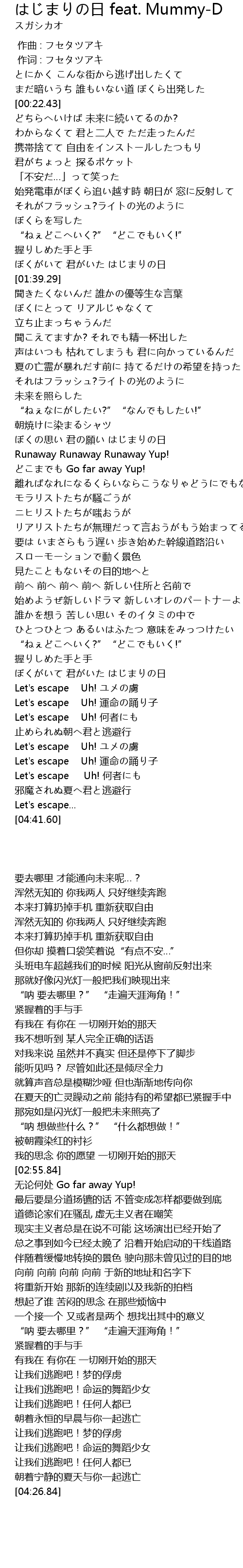 | [04:03.87] | Let's escape Uh! 何者にも |