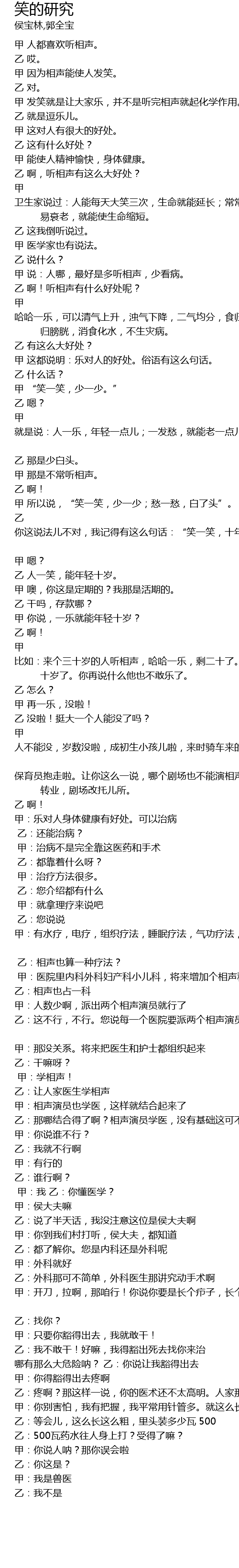 | 甲:医院里内科外科妇产科小儿科,将来增加个相声科 | |