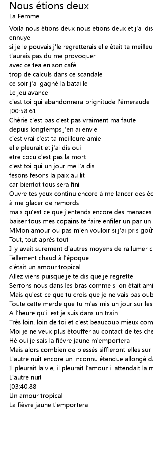 | [02:59.94] | Allez viens puisque je te dis que je regrette |