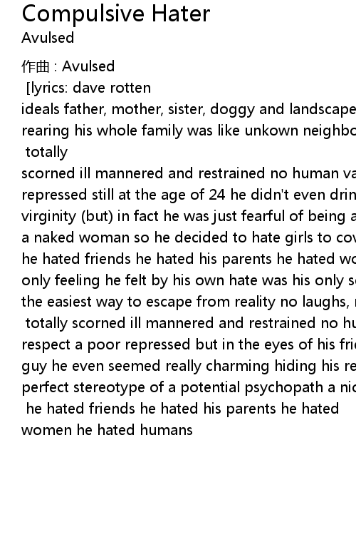 | music: cabra 10 98 lyrics: dave rotten grown into a world of preconceived ideals father, mother, sister, doggy and landscaped cottage affectionless rearing his whole family was like unkown neighbours to him he applied to them by their first names no signs of respect towards his own family chorus 1 totally scorned ill mannered and restrained no human values no self respect a poor repressed still at the age of 24 he didn' t even drink alcohol was proud of his virginity but in fact he was just fearful of being able to fulfil in front of a naked woman so he decided to hate girls to cover his sexual problem chorus 2 he hated friends he hated his parents he hated women he hated humans it was the only feeling he felt by his own hate was his only self proclaimed virtue was the easiest way to escape from reality no laughs, no love no signs of gratitude chorus 1 totally scorned ill mannered and restrained no human values no self respect a poor repressed but in the eyes of his friends he looked like a normal guy he even seemed really charming hiding his real inner feelings he was a perfect stereotype of a potential psychopath a nice person from outside natural born hater inside chorus 2 he hated friends he hated his parents he hated women he hated humans |