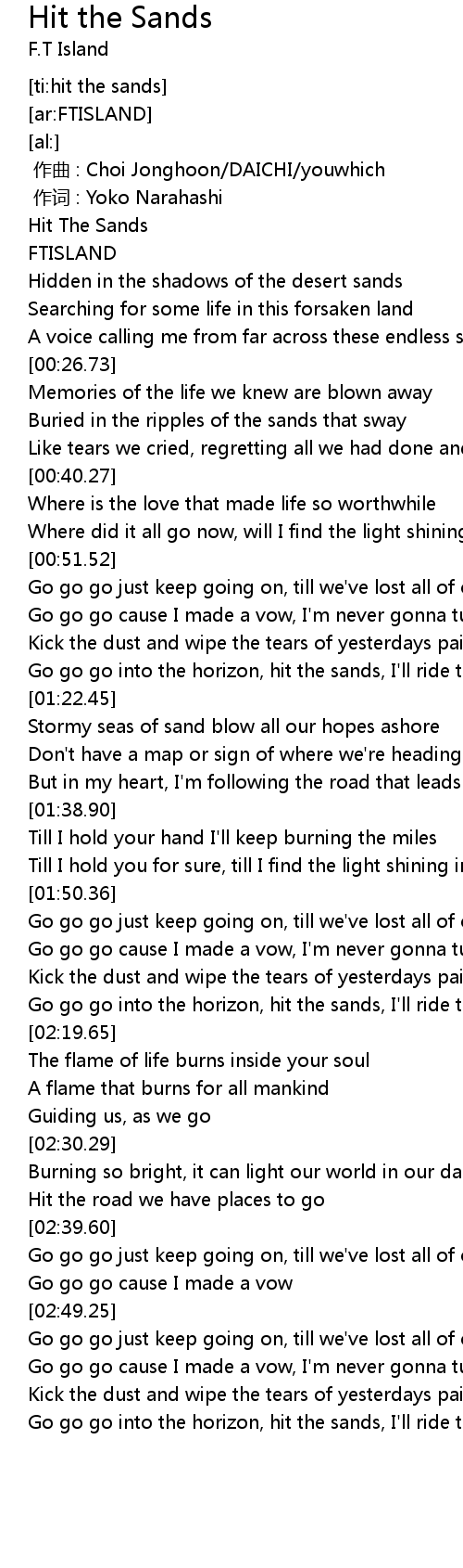 | [02:09.17] | Go go go into the horizon, hit the sands, I'll ride the wind to you |