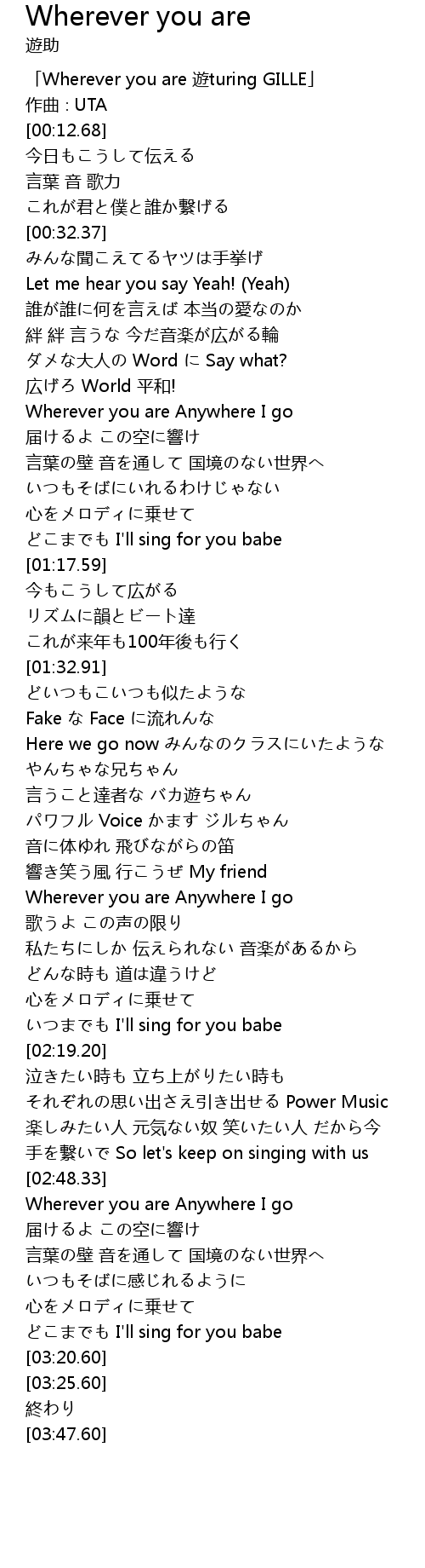 | [00:00.68] | 「Wherever you are 遊turing GILLE」 |