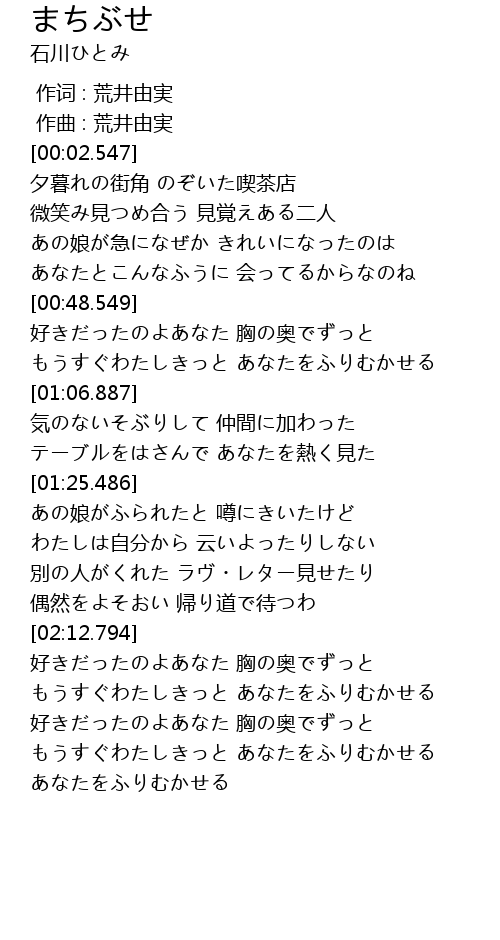 | [02:32.046] | 好きだったのよあなた 胸の奥でずっと |