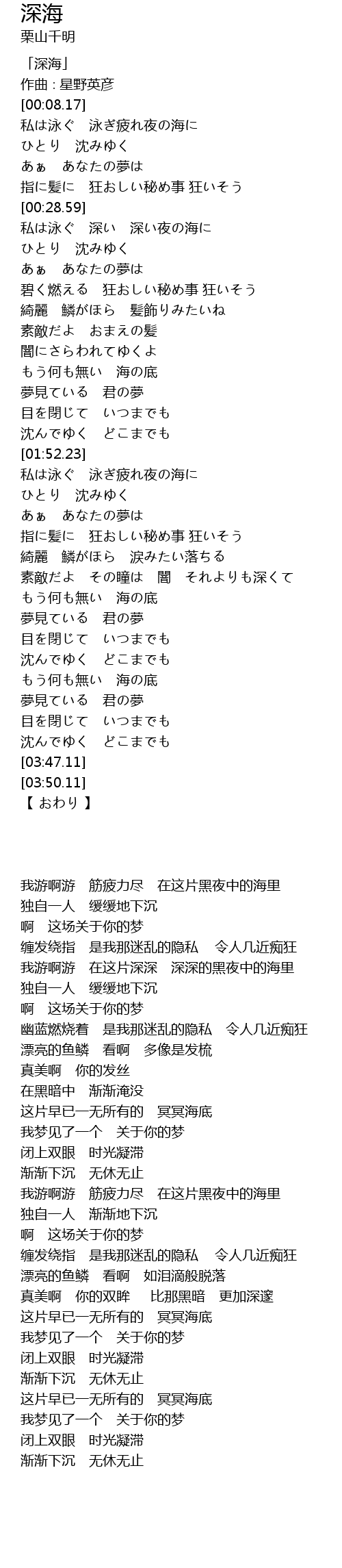 | [00:50.33] | 私は泳ぐ 深い 深い夜の海に |