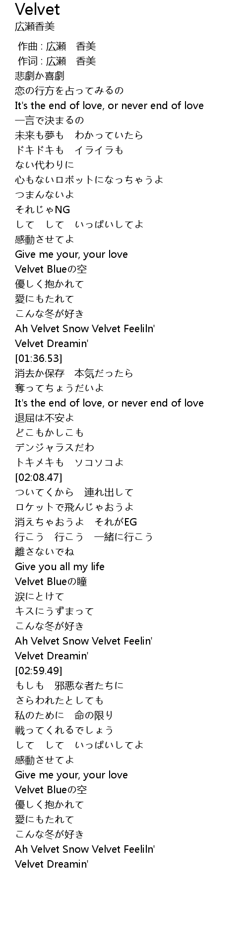 | [02:47.83] | Ah Velvet Snow Velvet Feelin' |