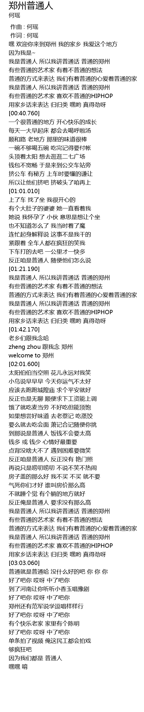 | [00:20.200] | 我是普通人 所以我讲普通话 普通的郑州 |