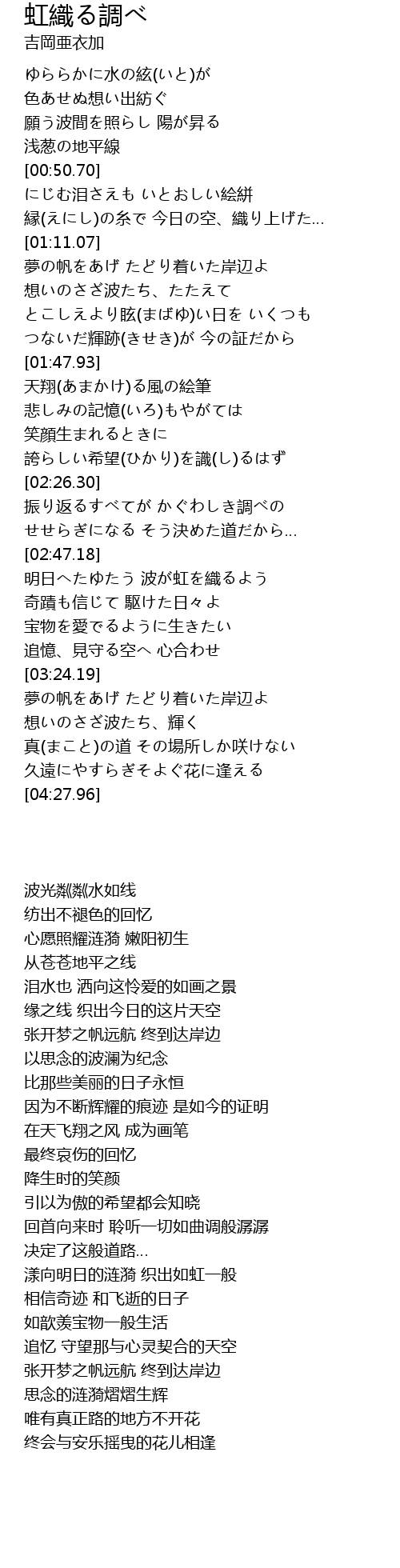 | [02:47.60] | 明日へたゆたう 波が虹を織るよう |