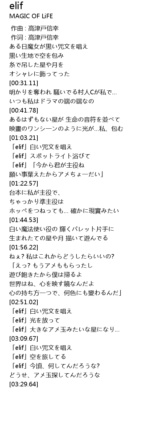 | [03:02.89] | 「elif」大きなアメ玉みたいな星になり… |