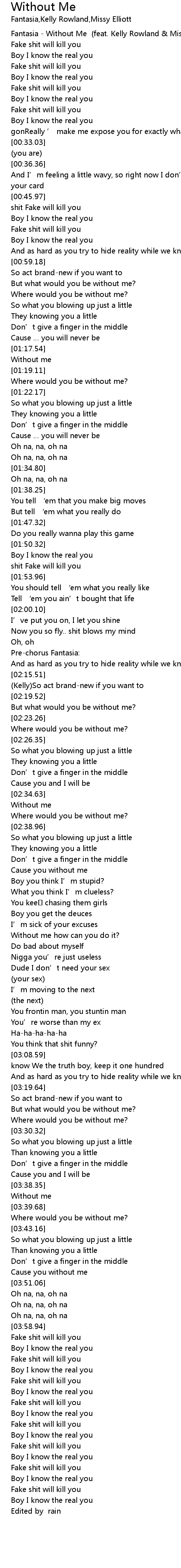 | [00:00.47] | Fantasia - Without Me (feat. Kelly Rowland & Missy Elliott) |