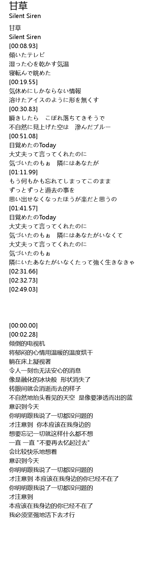| [01:53.43] | 気づいたのもぉ 隣にはあなたがいなくて |