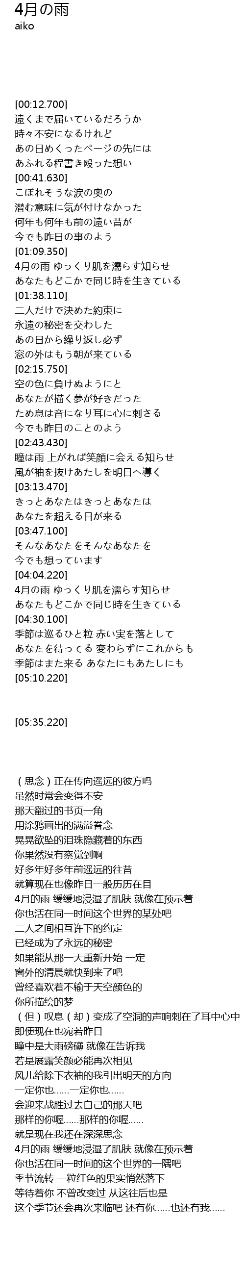 | [04:05.100] | 4月の雨 ゆっくり肌を濡らす知らせ |