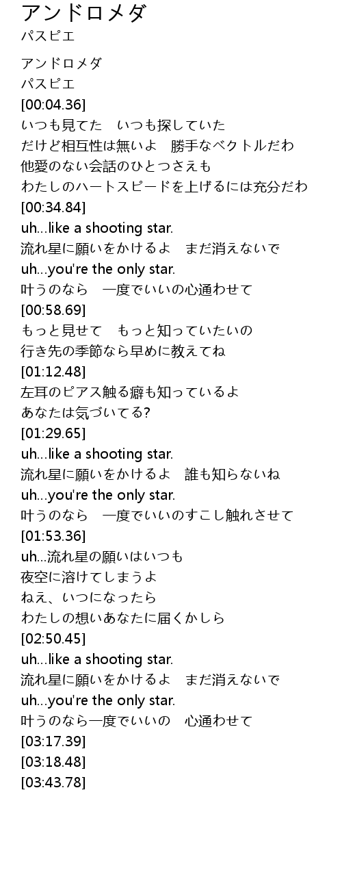 | [00:39.32] | 流れ星に願いをかけるよ まだ消えないで |