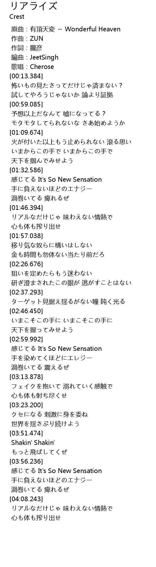 | [00:01.211] | 原曲:有頂天変 ~ Wonderful Heaven |