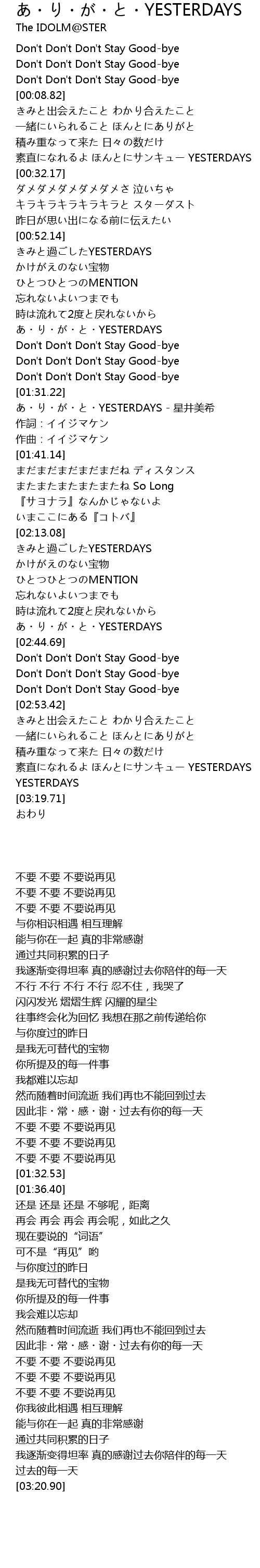 | [01:32.53] | あ・り・が・と・YESTERDAYS - 星井美希 |