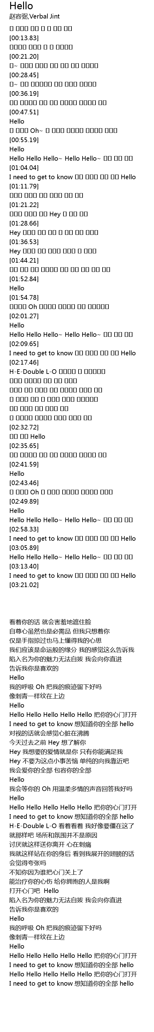 | [02:02.97] | Hello Hello Hello~ Hello Hello~ 닫힌 너를 열어 |