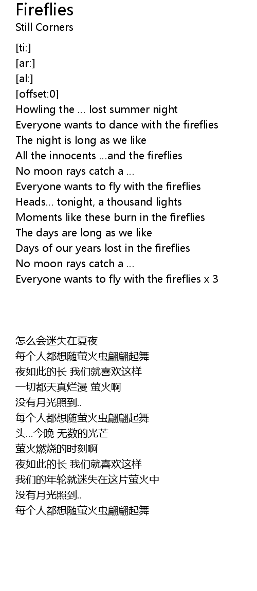 | [00:20.66] | Everyone wants to dance with the fireflies |