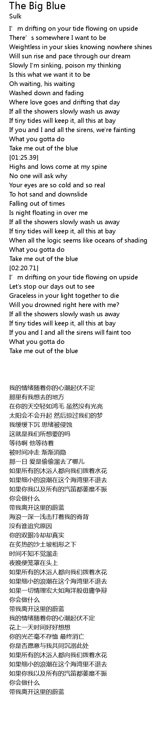 | [02:15.72] | Take me out of the blue |