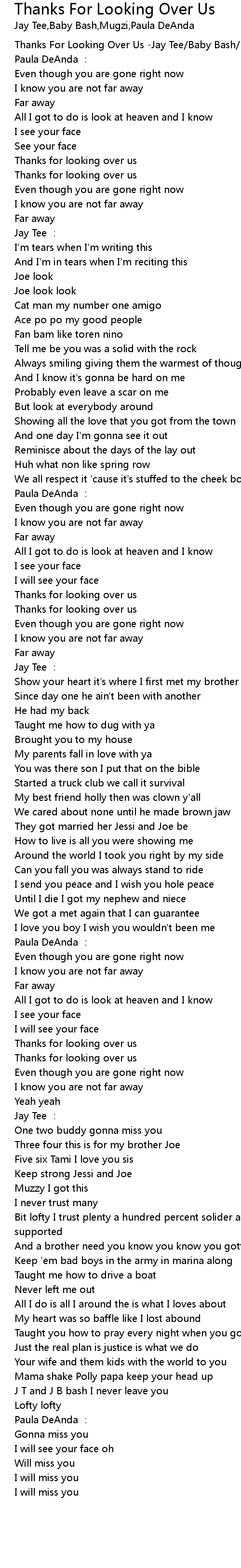| [00:00.261] | Thanks For Looking Over Us Jay Tee Baby Bash Mugzi Paula DeAnda |