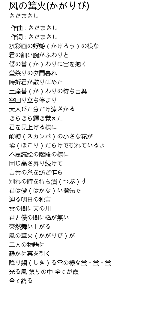 | [03:13.066] | 光る風 祭りの中 全てが霞 |