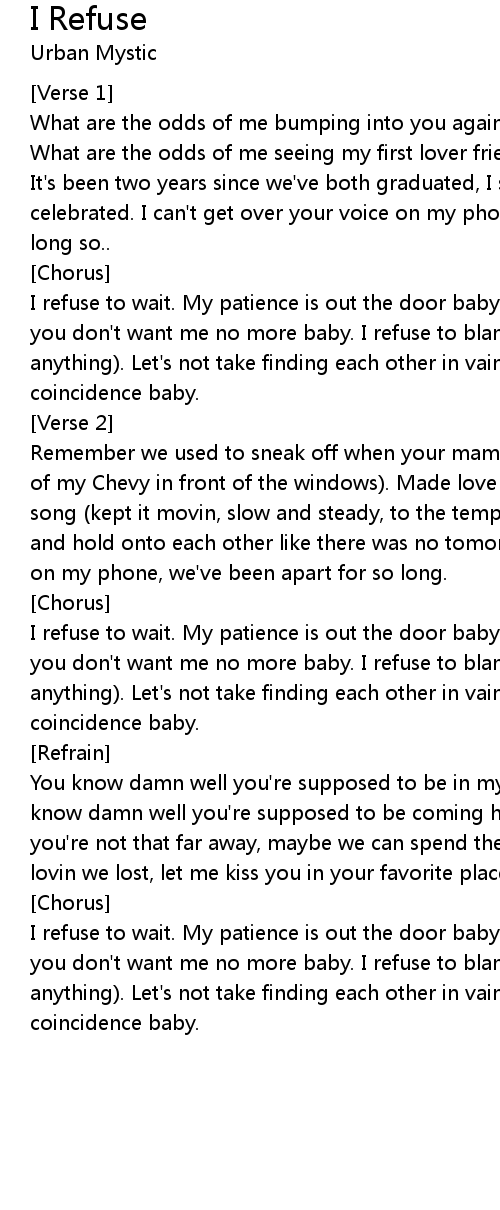 I refuse to wait. My patience is out the door baby. And I refuse to hear you say |